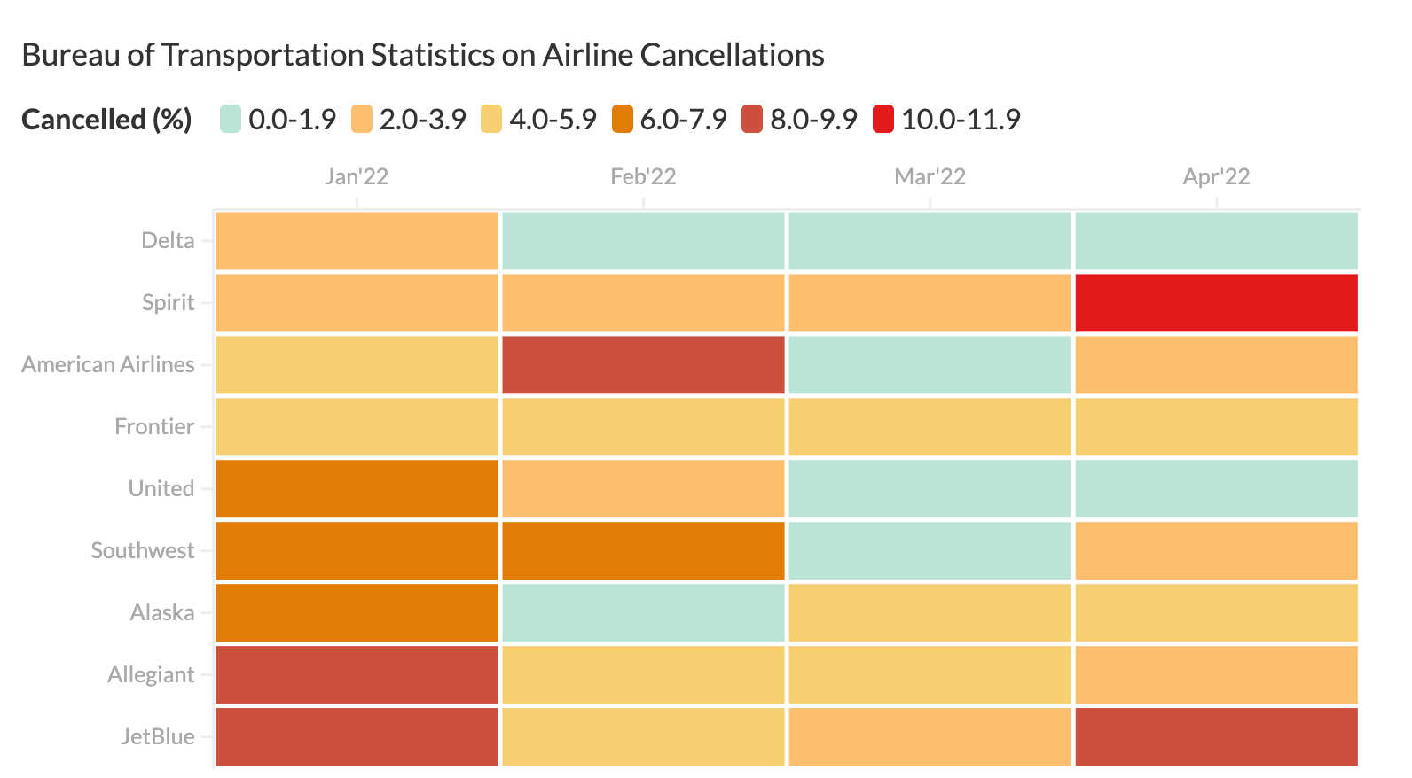 Downloads are also increasing month-over-month since January for all carriers except Spirit, JetBlue and Alaska. Accordingly, the declining growth impacted Spirit in April, when it had its highest rate of cancellations at 10%. This is the same month that the American Airlines app ranked #3 in Spirit's Cross App Usage index for iOS users. Apptopia Cross App Usage ranks the overlapping audiences of one app to another in a given month. Prior to April, American Airlines had not ranked as an app that was used by a significant amount of Spirit app users.