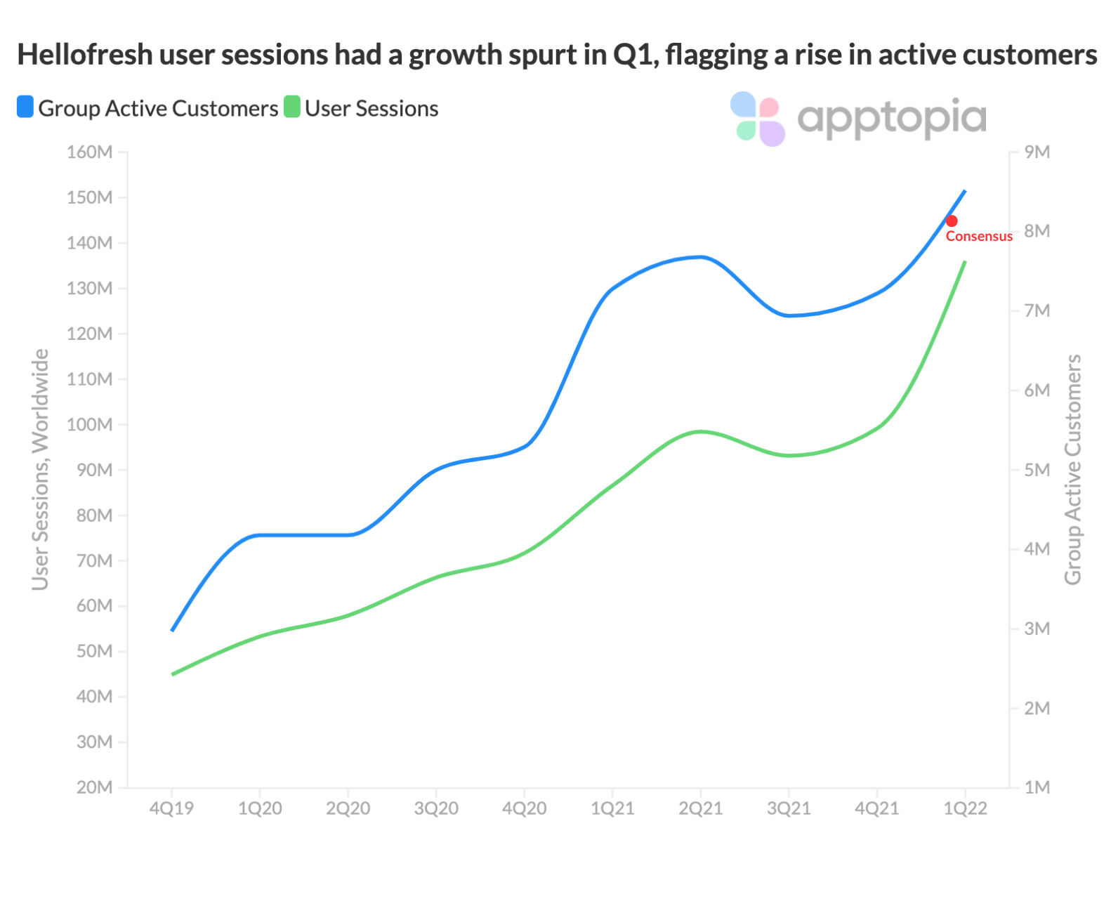 Hellofresh was featured in our earnings review, something we publish for our Alpha Intelligence clients on a quarterly basis. The number one thing that made HFG an undeniable ticker to keep an eye on was our Sessions figure increasing +57% YoY. This tremendous growth in app activity was reflective of HFG’s earnings call. HFG Active customers came in +3%, and US Revenues +8% above consensus.