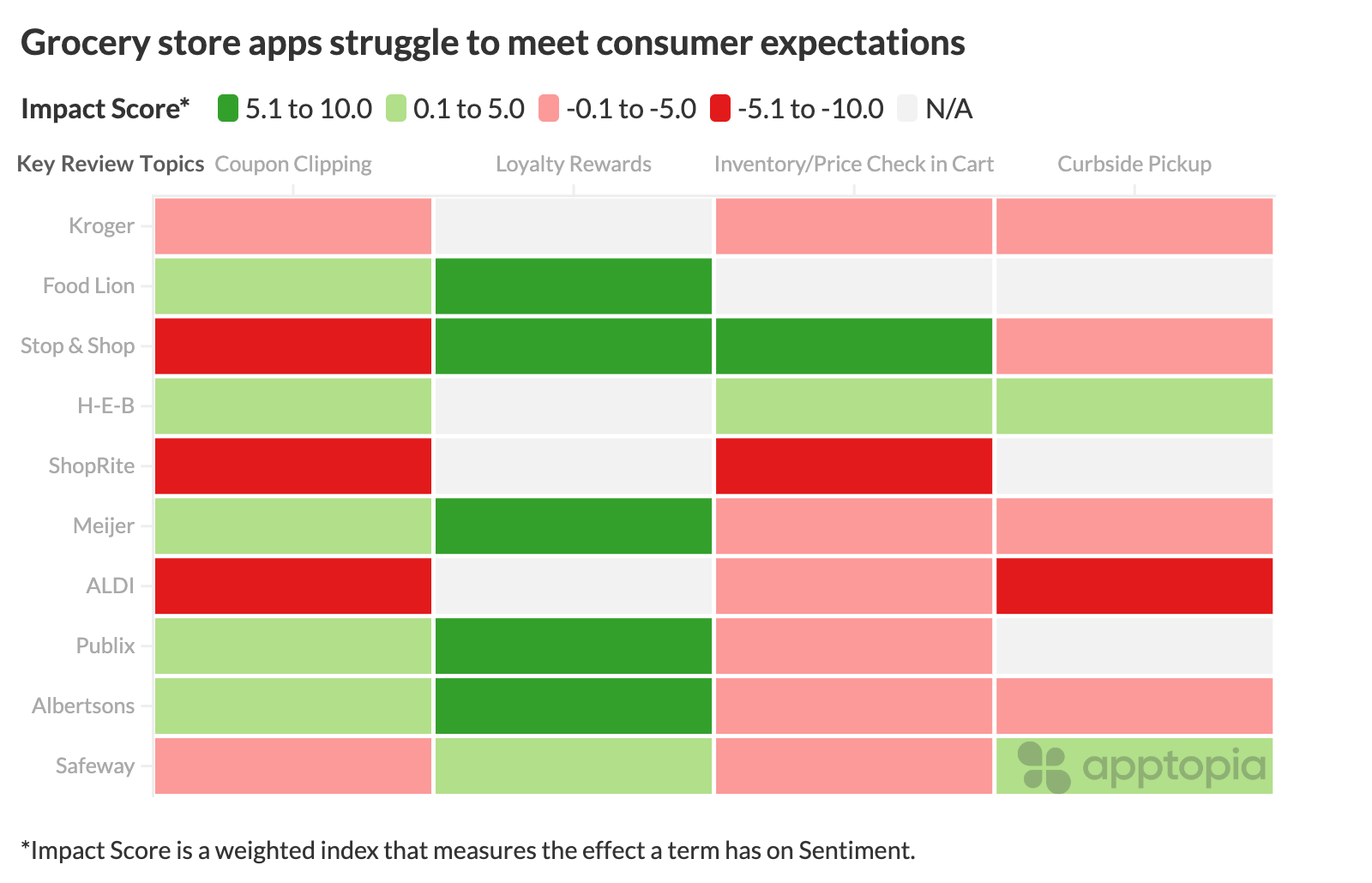 To that end, the market is not necessarily prepared to capitalize on the opportunity at hand. In the heatmap below, you can see that, for most stores, the valued feature associated with the keywords has a negative impact on review Sentiment Score. For Kroger, Meijer and Food Lion, "Walmart" is a top keyword as users write about switching to the national superstore chain for its superior mobile experience.