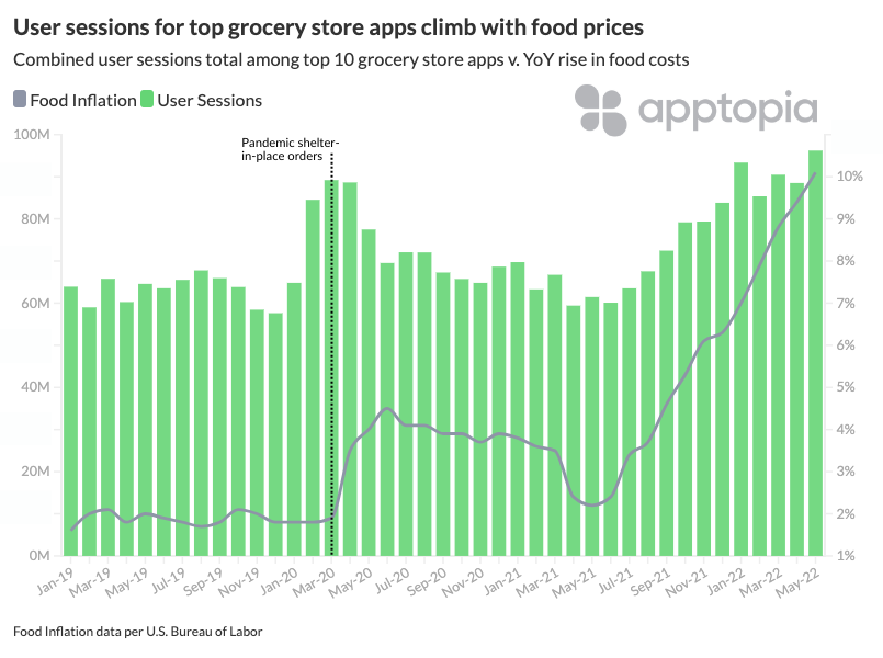 Among the top grocery store apps, user sessions were up 77% year-over-year in May, and reviews mentioning the word "coupon" shot up 75% from April. User sessions began to rise concurrently with food prices since Q3 2021.