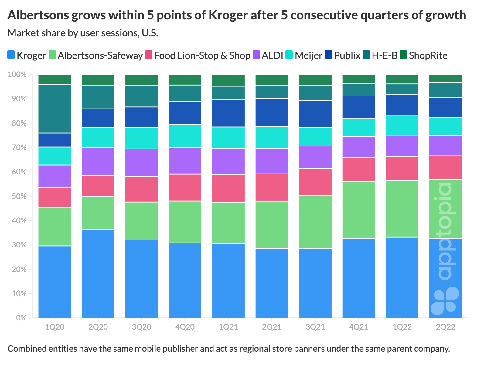 The record usage is primarily driven by inflation concerns, according to further analysis in a new report today, "Inflated Retail Records". Prior to this year, Top 10 Grocery Store apps peaked during Q1 2020, when lockdowns began and omnichannel shopping became a safety protocol. All stores in the market reacted by doubling down on feature development the rest of 2020, according to our X-Ray Intelligence. Despite a drop off in mobile innovation since then, sessions in Q1 2022 beat the 2020 record by 13% and Q2 activity is projected to be 30%.