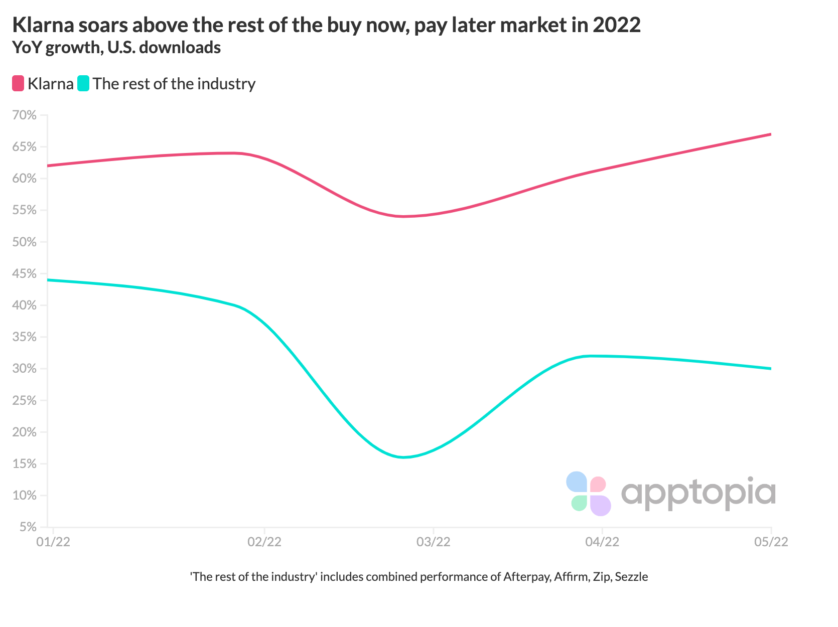 Separating Klarna from the other BNPL players, you can see in the chart above that its download growth reached 67% YoY compared to the rest of the market at an average of 30% YoY in May. Converting more U.S. shoppers from credit cards to another form of consumer debt is risky right now for consumers and Klarna alike. Speculation surrounded Klarna’s recent layoffs that the company must be anticipating more consumer loan defaults as a recession takes its toll. After all, the engagement acceleration seen in both charts speaks to the fact that more consumers are using the loan provider (and to the point above, probably to manage multiple purchases). Whether the debt will be, as Klarna calls it, “sustainable,” remains to be seen.