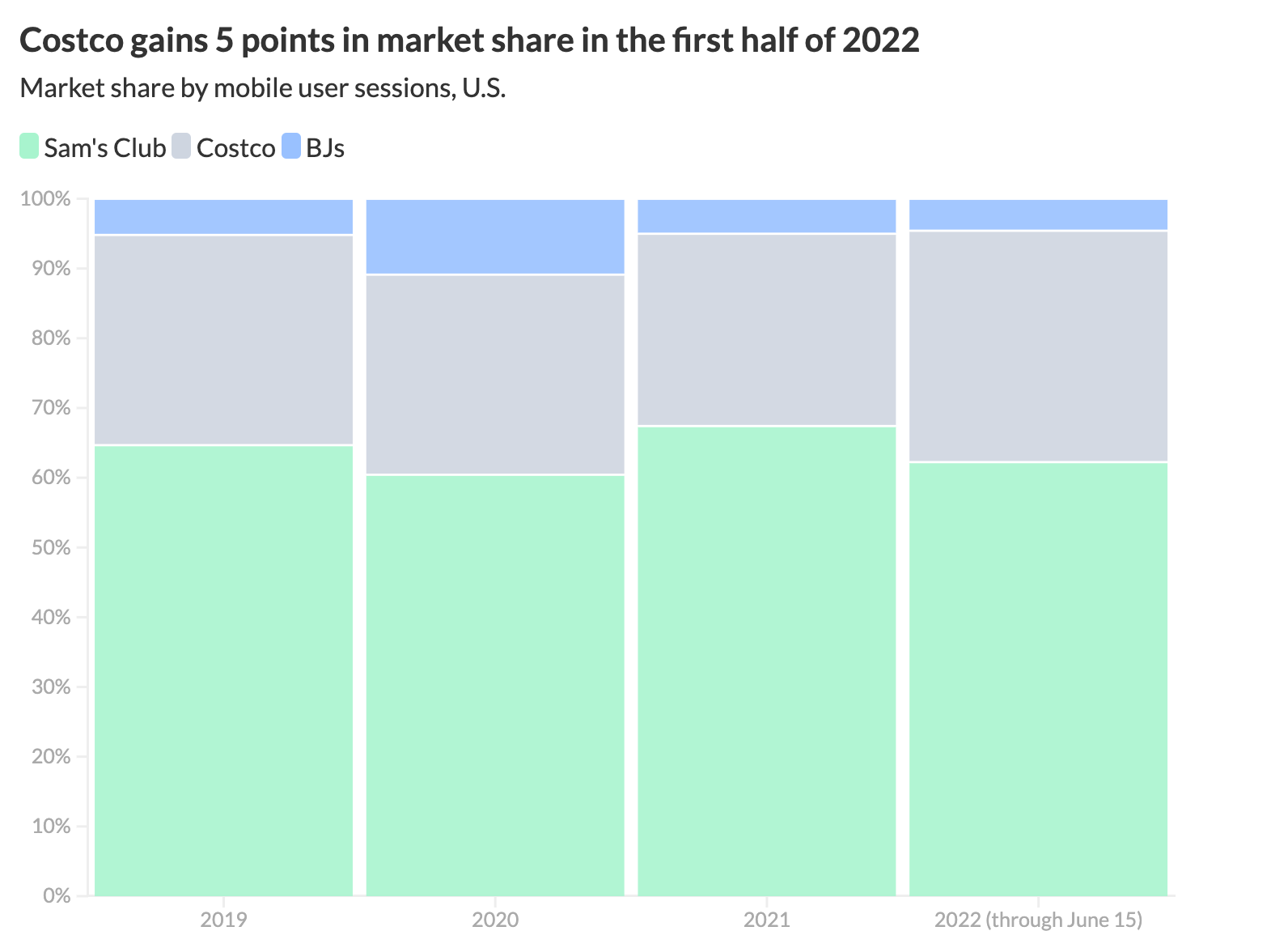 The instant gratification of a lower tab at the BJs or Costco pumps, compared to a delayed 10% cashback (also requiring a credit card) from Sam's Club, could be what's moving the needle for BJs and Costco. Though you can't see in the market share chart above, BJs is the fastest grower so far in 2022 with 23% quarter-over-quarter (QoQ) growth in user sessions in Q1 and 16% QoQ growth in Q2. As a regional club on the East Coast, its session count is significantly less than Costco and Sam's Club, so the relative numbers are only enough to maintain its market share among Costco and Sam's Club. Meanwhile, Costco's combined QoQ gains in sessions (14% in Q1 and 8% in Q2) added 5 points to its market share by user sessions, directly impacting Sam's Club (-2% in Q1 and 5% in Q2).
