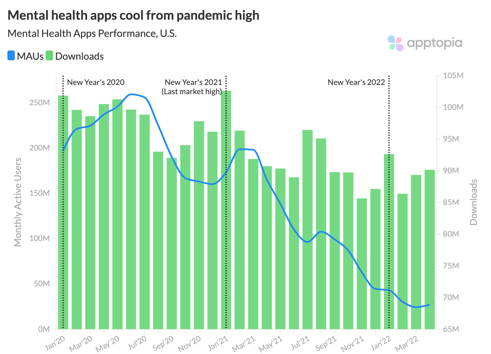 First-time downloads of ‘pandemic-winning’ mental wellness apps in the U.S were 15% lower this April than in April 2019. By contrast, downloads in April 2020 were up 21% YoY from April 2019, which kicked off investor interest in the category.