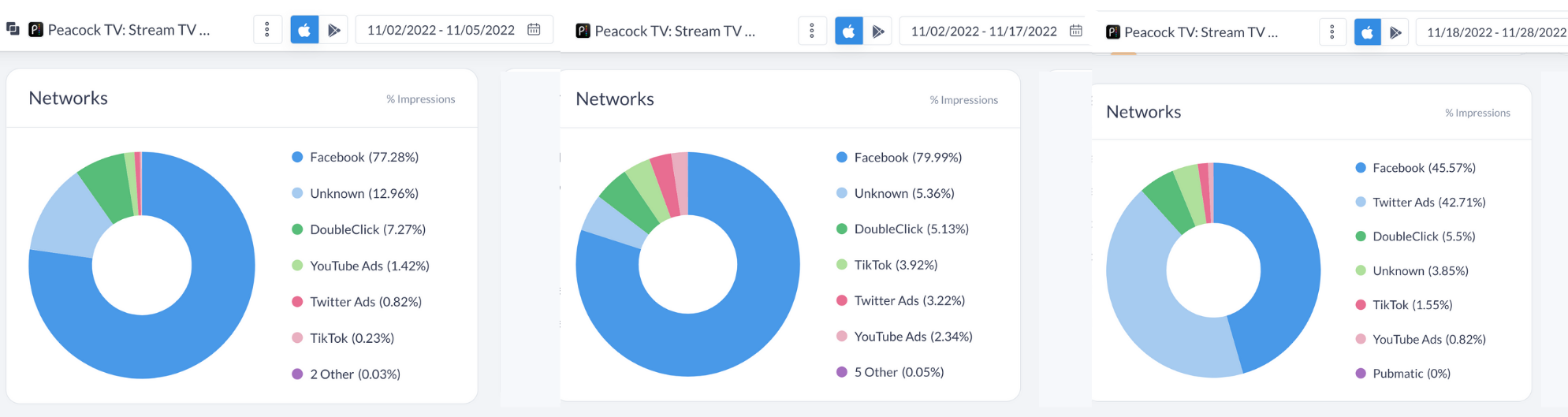 Notably, two of the leading Streaming apps for World Cup viewers, FOX Sports and Peacock TV, increased Twitter ads targeting iOS users in November. FOX Sports went from Twitter ads representing 9% of all iOS ads in October to 63% in November, and the initial increase in allocation toward the Ad Network match the days that Elon Musk assumed position as CEO.
