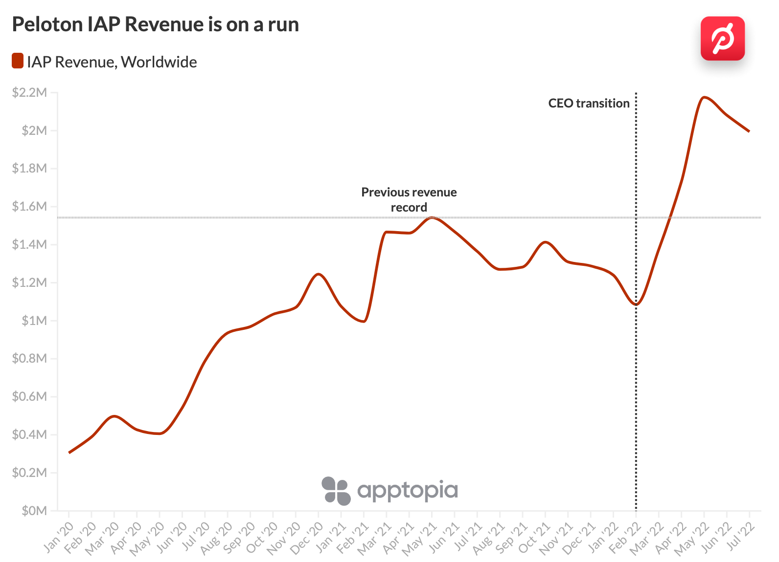 Peloton IAP Revenue increased 200% in just three months after the appointment of Barry McCarthy to CEO. Since April, worldwide IAP Revenue has been climbing past the previous record high, set in May 2021. August appears on pace to continue the streak, and estimates to date are already 5% positive growth from August 2021.