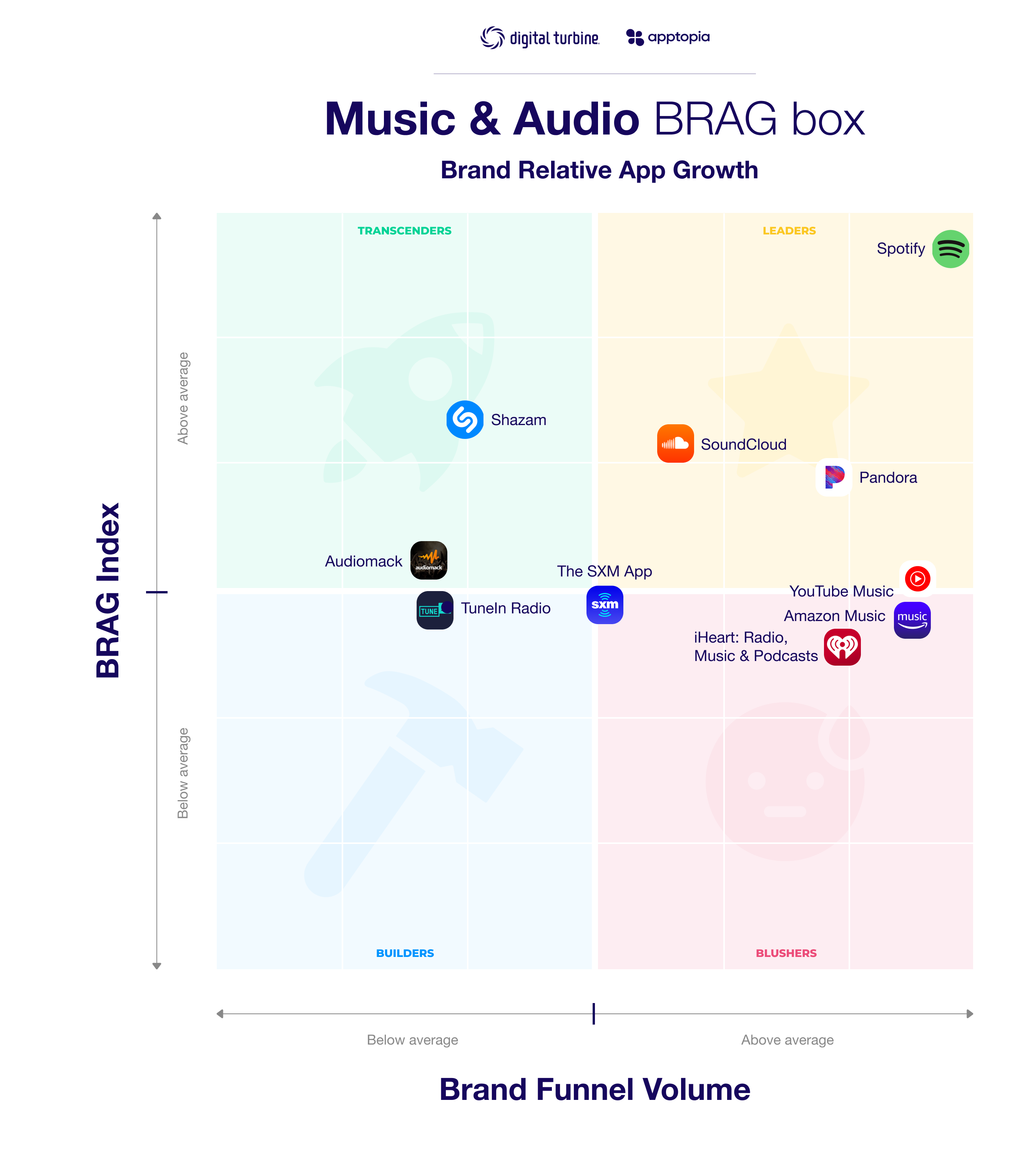 The Top 20 Music & Audio apps, as a category, had the third highest brand funnel scores, behind Food & Drink apps and Streaming Video apps. In other words, consumers are aware of most apps in the market and express interest in downloading one or more of the music streaming services. The right side of the BRAG Box below shows the apps with the highest consumer awareness and “intent to install”. The difference between the Leaders and the Blushers is the app’s ability to convert that intent to actual installs at the end of Q4 and Q1.