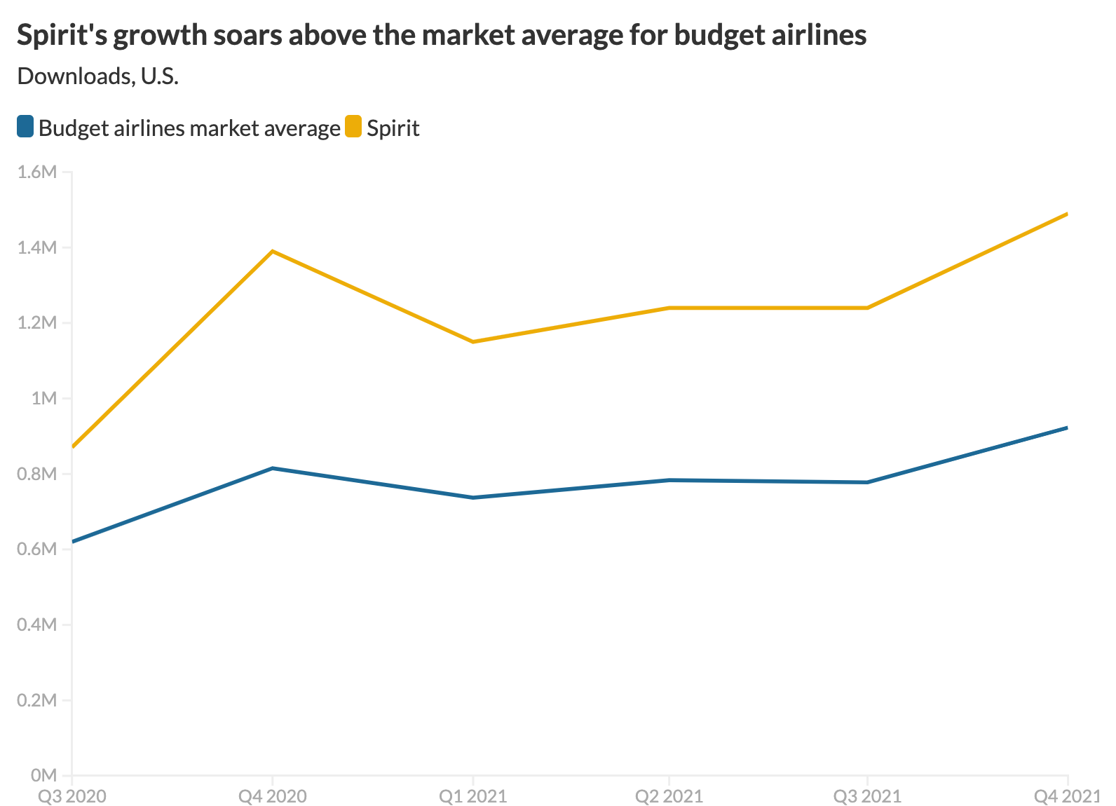 We analyzed the trajectory of Spirit's market share since 2019 last month when Frontier announced its intent to purchase and combine the budget airlines. The market share fluctuations continued through the end of last month (Southwest regained market share), proving airlines are paying attention to mobile.