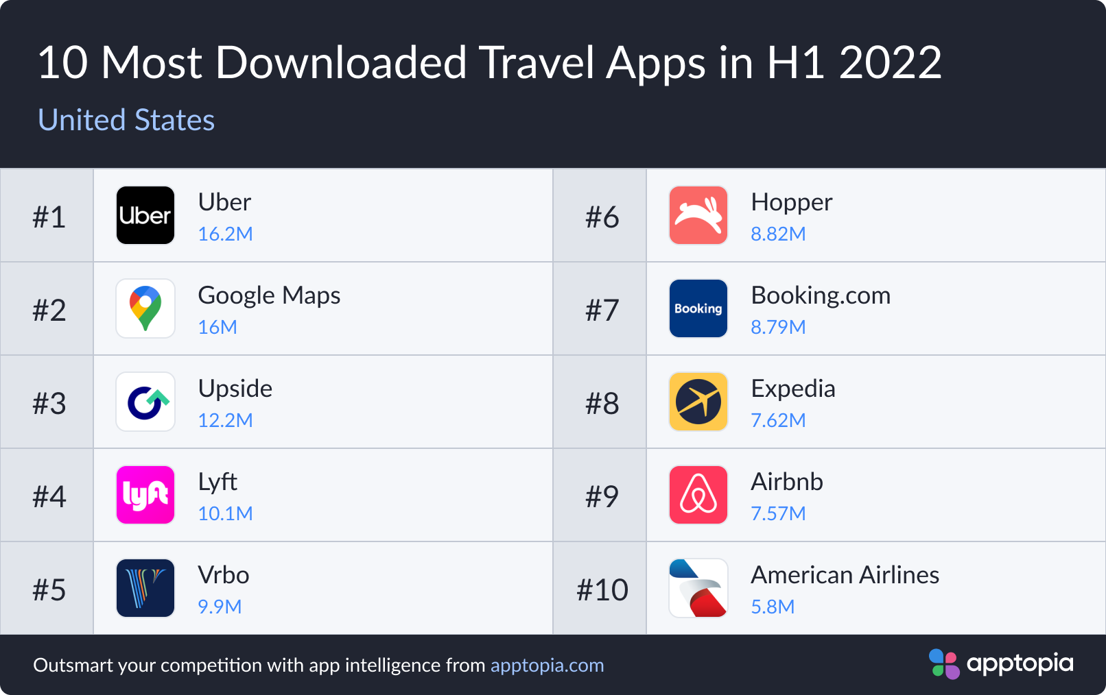For the first time, gas savings and flight tracking apps appear in the 10 Most Downloaded Travel Apps, a sign of the times during this first half of 2022. FlightRadar24 ranks tenth worldwide, and Upside (cash back on gas) is the third most downloaded travel app in the U.S. The other changes in rank since our 2021 download leaders list shows up among ridesharing and online travel agency (OTA) apps.