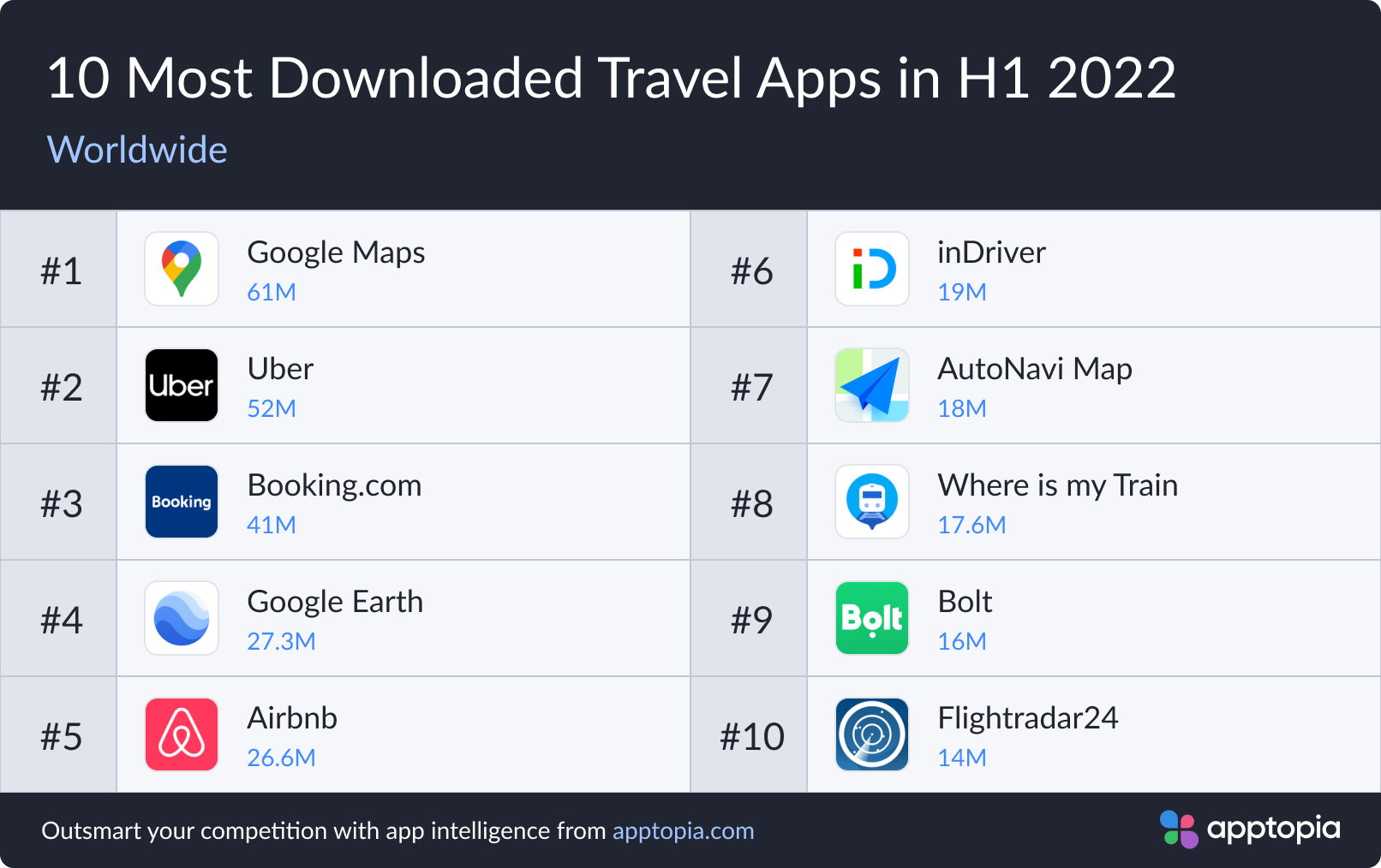 The top 5 travel apps worldwide so far in 2022 are the exact same as for the full year 2021 that we reported in January, but in the second half of the list new entrants include inDriver, AutoNavi Map, and FlightRadar24. FlightRadar24 uses augmented reality to let users scan a plane in the sky and learn the plane's origin, destination, and schedule. Flight routes became interesting to people when Russia invaded Ukraine and the no-fly zone over the country sent planes on curious re-routes. So much so that FlightRadar crashed in March. More recently, it's become a popular way for travelers to manage travel expectations amidst record flight cancellations.